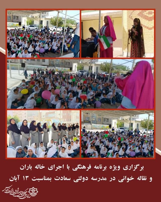 برگزاری ویژه برنامه فرهنگی با اجرای خاله باران و نقاله خوانی در مدرسه دولتی سعادت بمناسبت ۱۳ آبان