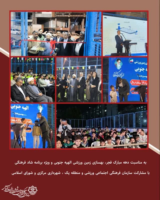 به مناسبت میلاد باسعادت امام مهدی (ع) ، دهه فجر و پیروزی انقلاب اسلامی بهسازی زمین ورزشی الهیه جنوبی و ویژه برنامه شاد فرهنگی با مشارکت سازمان فرهنگی ورزشی اجتماعی ، شهرداری مرکزی ،منطقه یک وشورای اسلامی.
