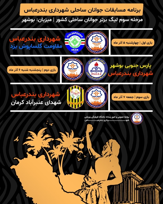 ����به گزارش روابط عمومی باشگاه فرهنگی ورزشی شهرداری بندرعباس؛ برنامه مرحله سوم لیگ برتر جوانان ساحلی کشور از سوی سازمان لیگ فوتبال کشور اعلام شد. این مرحله در دو گروه چهارتیمی و به میزبانی رودسر و بوشهر برگزار خواهد شد.
