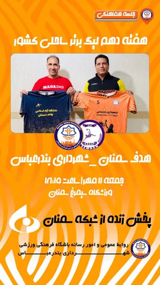 شهرداری بندرعباس به عنوان تیم میهمان، با ترکیب لباس کامل نارنجی به میدان برود. این دیدار روز جمعه ۱۱ مهرماه از ساعت ۱۸:۱۵ از شبکه سمنان بصورت زنده و مستقیم پخش خواهد شد.