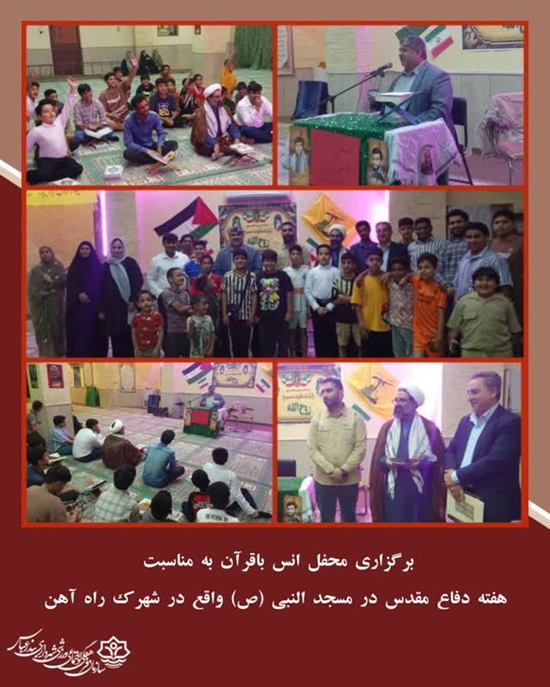 برگزاری محفل انس باقرآن به مناسبت هفته دفاع مقدس و گرامیداشت شهدای جنگ ۱۲ روزه به همت سازمان و پایگاه مقاومت بسیج روح الله شهرک راه آهن در محل مسجد النبی (ص) شهرک راه آهن با حضور رسول جهانداری رئیس سازمان فرهنگی اجتماعی ورزشی شهرداری بندرعباس، نصیری مدیرکل راه آهن هرمزگان ، احسان عاشوری فرمانده حوزه مقاومت بسیج شهید مدافع حرم عبدالحمید سالاری شهرک پیامبراعظم(ص)، حاج آقا پورنصیر فرمانده پایگاه، نوجوانان ، جوانان و خانواده ها