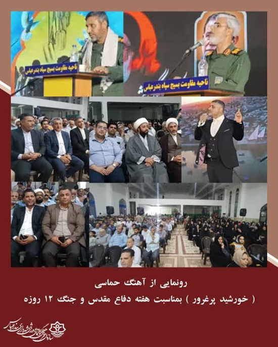 رونمایی از آهنگ حماسی ( خورشید پرغرور ) بمناسبت هفته دفاع مقدس و جنگ ۱۲ روزه به گزارش روابط عمومی سازمان فرهنگی اجتماعی ورزشی شهرداری بندرعباس ، رسول جهانداری رئیس سازمان ضمن گرامیداشت هفته دفاع مقدس اظهار داشت: آهنگ فاخر حماسی ( خورشید پرغرور ) که هدایت دکتر احسان کامرانی و سروده استاد محمد علی قویدل فرد و آهنگسازی و خوانندگی عمران طاهری هنرمند مطرح استان می باشد بمناسبت هفته دفاع مقدس و جنگ ۱۲ روزه در برنامه گردهمایی رزمندگان و پیشکسوتان جهاد و شهادت رونمایی شد.