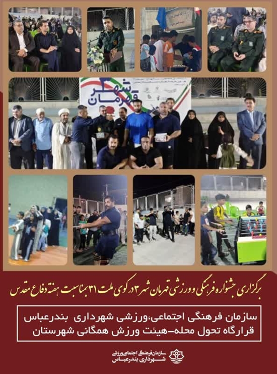 به گزارش روابط عمومی سازمان فرهنگی، اجتماعی ورزشی شهرداری بندرعباس؛ با حضور سردار امیری جانشین سپاه امام سجاد (ع)هرمزگان،سرهنگ کمالی فرمانده ناحیه مقاومت بسیج سپاه بندرعباس، یعقوب دبیری نژاد و فریده عامری دو عضوشورای اسلامی شهر، محمد حسینی دبیرهیئت ورزشهمگانی استان و مسئولان و مدیران سازمان فرهنگی اجتماعی ورزشی شهرداری بندرعباس و هیئت ورزشهای همگانی هرمزگان، و با حضور مردم بسیار خونگرم محله کوی ملت مسابقات قهرمان شهر در زمین ورزشی واقع در محله کوی ملت برگزار گردید.