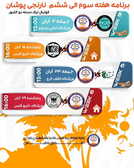برنامه هفته سوم الی ششم شهرداری بندرعباس در لیگ دسته دو کشور
