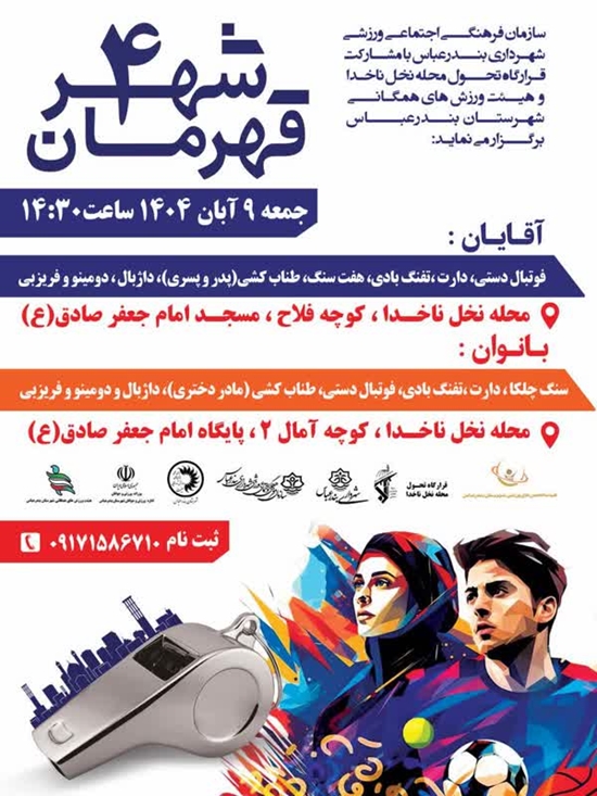 سازمان فرهنگی اجتماعی ورزشی شهرداری بندرعباس با مشارکت قرارگاه محله نخل ناخدا و هیئت ورزش های همگانی شهرستان بندرعباس برگزار می نماید: